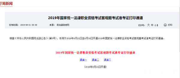 2019年国家统一法律职业资格考试月底即将开考,记者今天(8月21日)从司法部网站上了解到,客观题从今天开始可以打印准考证了,各位考生可以登录司法部官方网站打印。
