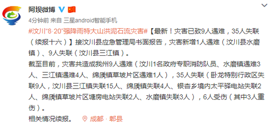 荔枝新闻讯 今日(22日)4时55分,阿坝州委宣传部发布汶川“8·20”强降雨特大山洪泥石流灾害最新情况通报。通报称接汶川县应急管理局书面报告,灾害新增1人遇难(汶川县水磨镇)、9人失联(汶川县三江镇)。