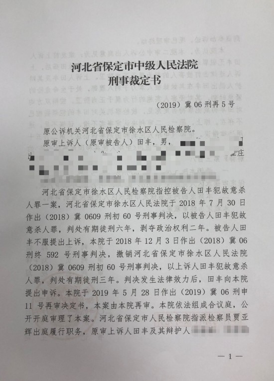 今年7月26日,保定市中级法院作出刑事裁定书,撤销原来本案一、二审判决,发回徐水区法院重新审判。