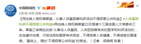 [民法典人格权编草案:从事人体基因等科研活动不得损害公共利益]#人体基因科研不得损害公共利益#民法典人格权编草案22日提请十三届全国人大常委会三审。草案三审稿在此前“从事与人体基因、人体胚胎等有关的医学和科研活动的,应当遵守法律、行政法规和国家有关规定,不得危害人体健康,不得违背伦理道德。”基础上,增加“不得损害公共利益”的表述。(记者 梁晓辉 张素)