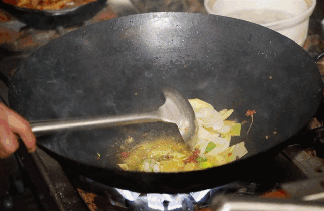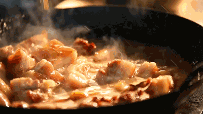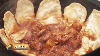 面饼的四分之一浸没在地锅鸡的汤汁中,随着温度的升高,面饼里的淀粉逐渐析出,和汤汁充分混合,等到汤汁变得更加浓稠时,美味也逐渐渗透到面饼中,形成厚重的口味。