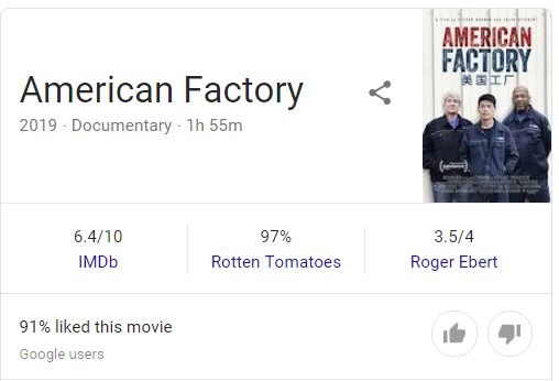 《美国工厂》刚上映,就受到了媒体和观众们的热议。目前的评价大体还不错。