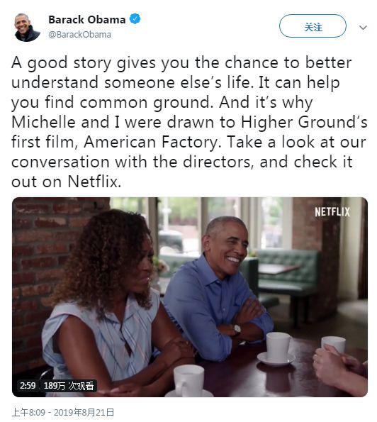 不过,(当地时间)昨天奥巴马在Twitter上为《美国工厂》打call时,倒是显得云淡风轻,颇有一种“岁月静好”的文艺感。