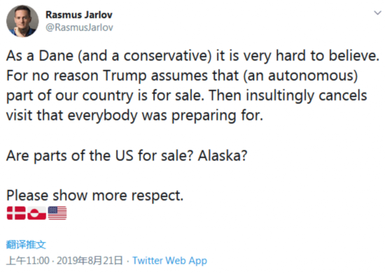 无独有偶,丹麦保守党议员拉斯穆斯·贾洛夫(Rasmus Jarlov)同日也在怒怼特朗普时提及阿拉斯加。他在推特发文反问特朗普:“作为美国一部分的一些地区可以被出售吗?阿拉斯加怎么样?请多一些尊重吧。”