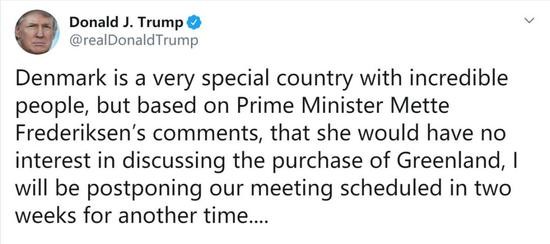 特朗普20日晚在推特上发帖表达“不满”:“鉴于丹麦首相的言辞,显示她对讨论格陵兰岛售卖事宜不感兴趣,我将推迟原定于未来两周内举行的会晤。”