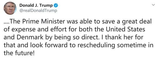 他还“更推”一条:“首相如此直接,倒是为美国和丹麦省下大量开销和精力。我为此感谢她,期待以后再找时间吧!”