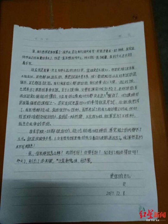 罗某某的朋友圈中,还保存着女儿的照片、奖状和亲笔信。2017年12月8日,小菲在写给父亲的信中道:“这应该是我第一次去那么远的地方上学,您难免会不放心”。像每一个大一女生一样,她开心地聊起自己的宿舍生活:“我们宿舍的人都挺好的,我们经常一起上下课、一起吃饭,也培养出了深厚的革命友谊”。信的末端,她问候道:“爸,你在那边怎么样?吃得可好?冬天了,别忘了添衣服,注意身体,别太累”。