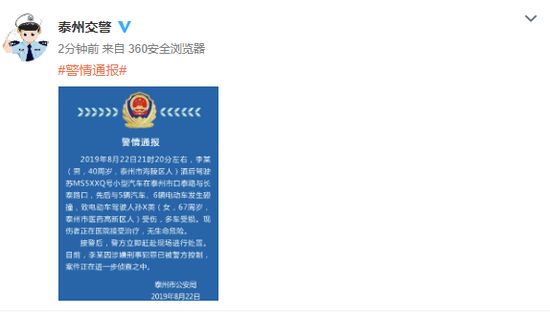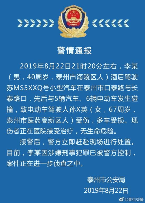 荔枝新闻讯 泰州公安发布警情通报:2019年8月22日21时20分左右,李 (男,40周岁,泰州市海陵区人)酒后驾驶苏MS5XXQ号小型汽车在泰州市口泰路与长泰路口,先后与5辆汽车、6辆电动车发生碰撞,致电动车驾驶人孙X英(女, 67周岁,泰州市医药高新区人)受伤,多车受损。现伤者正在医院接受治疗,无生命危险。