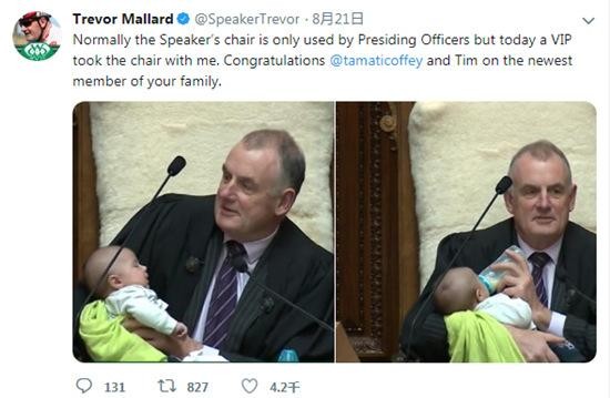 中新网8月23日电 (甘甜)日前,新西兰男议长特雷弗·马拉德因两张照片火了。照片中,马拉德在议会上一边主持辩论,一边帮忙照料另一名议员的婴儿,他给孩子喂奶的动作,看起来尤为娴熟。