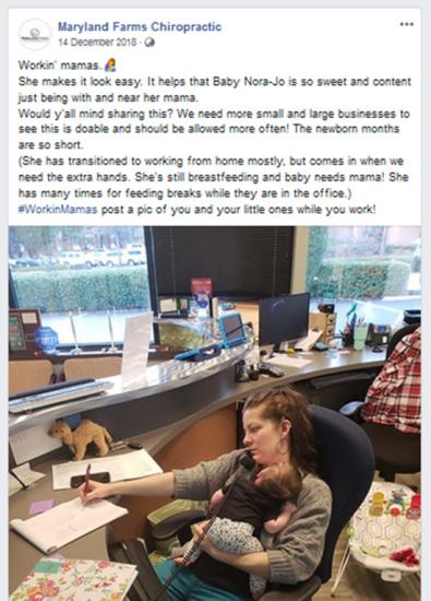 2018年12月,美国田纳西州的一家公司的老板伊丽莎白,在网上分享了一张员工的工作照。照片中,刚刚结束产假的梅洛迪·布莱克韦尔抱着5个月大的孩子,有条不紊地进行着各项工作。