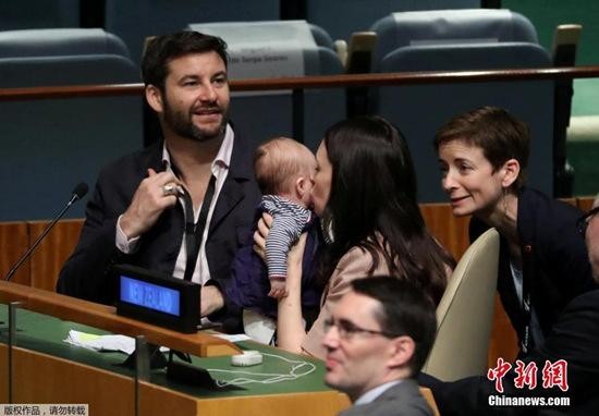 当地时间2018年9月24日,新西兰女总理杰辛达·阿德恩抱娃出席联合国大会。