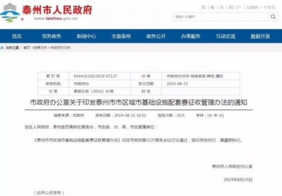 2019年10月1日起施行,《泰州市人民政府关于印发〈泰州市市区城市市政公用基础设施配套费征收管理实施办法〉的通知》(泰政发〔2000〕221号)同时废止。本办法生效之日前配套费已缴纳的建设项目,仍按照泰政发〔2000〕221号文件规定的标准执行。