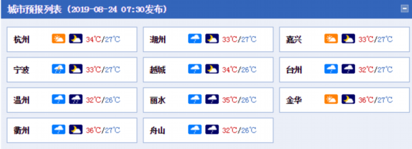 根据浙江省气象台今天发布的最新预报,今天浙江东南沿海地区阴有中到大雨,部分暴雨;其它地区多云到阴,部分有阵雨或雷雨,有雷雨地区局地可伴有短时暴雨。白天最高温度,浙北和沿海地区32-34℃,其它地区34-36℃。