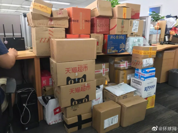 即使国豪的工位已经无法承受“快递之重”,依旧有网友表示:我还想给他来几个鸡腿!↓