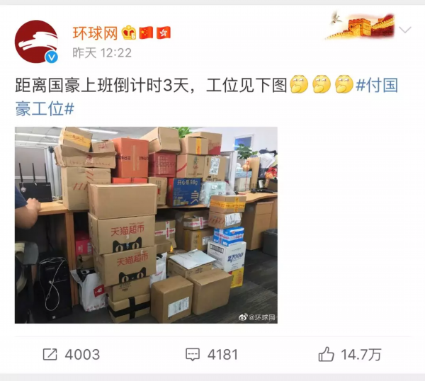 昨天(23日)中午,环环在微博@环球网发了一张付国豪的工位照。