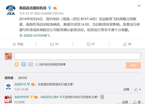 今日上午7时许,昌北机场通过官方微博发布消息称,8月24日,因3V820(南昌—烈日 B747-400)货运航班飞机故障占用跑道,南昌机场启动应急响应,跑道关闭至14:00,当日航班将受影响。旅客出行前请与机场或所乘航空公司联系确认航班动态。