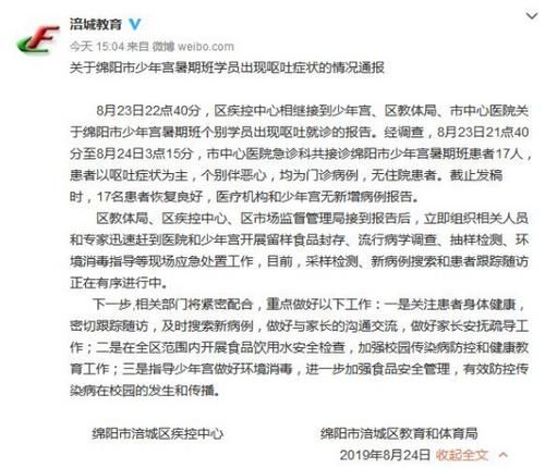 荔枝新闻讯 据绵阳市涪城区教育体育局官方微博消息,8月23日22点40分,涪城区疾控中心相继接到少年宫、涪城区教体局、市中心医院关于绵阳市少年宫暑期班个别学员出现呕吐就诊的报告。经调查,8月23日21点40分至8月24日3点15分,市中心医院急诊科共接诊绵阳市少年宫暑期班患者17人,患者以呕吐症状为主,个别伴恶心,均为门诊病例,无住院患者。截止发稿时,17名患者恢复良好,医疗机构和少年宫无新增病例报告。