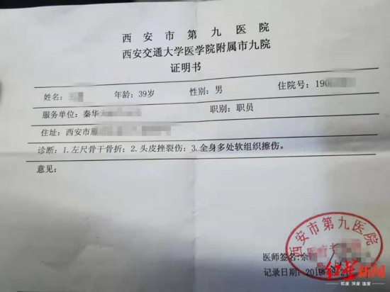 记者从西安市第九医院开具的诊断书上看到,王某左尺骨骨折、头皮搓裂伤、全身多处软组织擦伤。8月23日上午,王某在医院做完了手术,现在正在积极配合治疗。王某的妈妈说,从住院到现在,凯迪拉克车主的家属还没有前来探望,暂不清楚对方的身份。