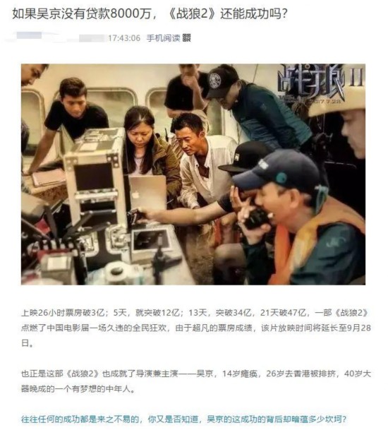 5月5日,因以《战狼2》为背景编撰营销文章,使用吴京照片,就有两家公司被吴京告上法院。