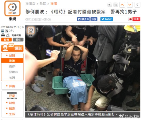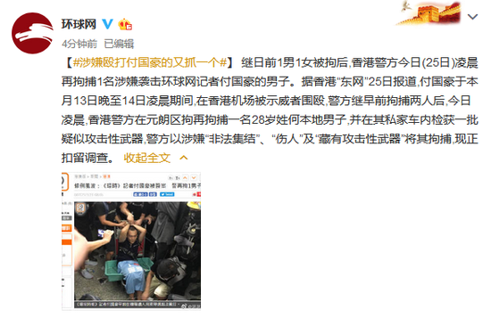 继日前1男1女被拘后,香港警方今日(25日)凌晨再拘捕1名涉嫌袭击环球网记者付国豪的男子。据香港“东网”25日报道,付国豪于本月13日晚至14日凌晨期间,在香港机场被示威者围殴,警方继早前拘捕两人后,今日凌晨,香港警方在元朗区拘再拘捕一名28岁姓何本地男子,并在其私家车内检获一批疑似攻击性武器,警方以涉嫌“非法集结”、“伤人”及“藏有攻击性武器”将其拘捕,现正扣留调查。