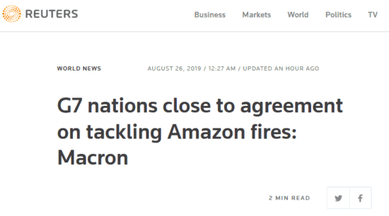 24日至26日,G7峰会在法国西南部海滨城市比亚里茨召开。路透社说,马克龙曾称亚马孙雨林大火为全球紧急事件,并将其列为此次峰会的首要议程。