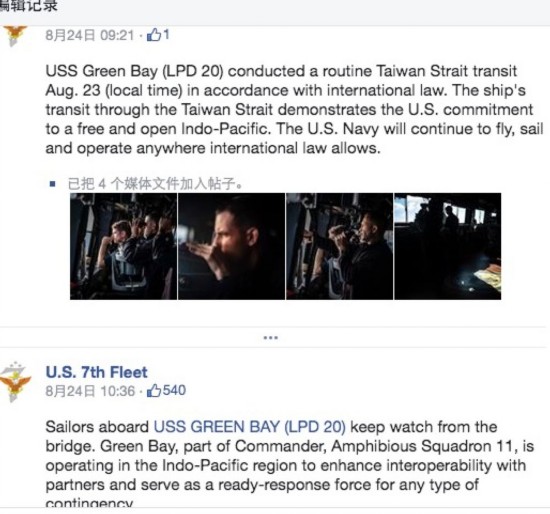 24日,第7舰队在脸书上公布“绿湾”通过台湾海峡时,指挥官在驾驶舱监控海面的照片。从画面中可以看到, ‘绿湾’号的舰长和两栖部队指挥官在船舰驾驶舱中,监测台湾海峡海面的情况。有趣的是,这些照片配文表示,“ ‘绿湾’号舰上官兵持续从舰桥监看相关目标。‘绿湾’号隶属第11两栖战队指挥部,在印太区域作业,以强化与伙伴间的作业互通能力,担任一支能因应各种突发状况的备便反应部队。”然而,在编辑记录中却能看到此前文字为“‘绿湾’号直接穿过台湾海峡,兑现美国对自由开放印度-太平洋的承诺。”
