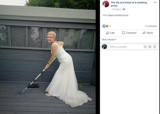 英国女子黎明穿着婚纱做清洁。图片来源:社交媒体截图。