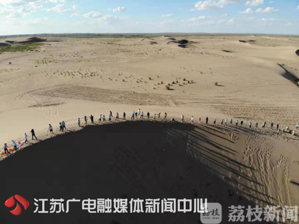 炎炎酷暑,远在甘肃东北部的腾格里沙漠中,一条由大学生组成的接水的长龙正蜿蜒在沙丘上,给脚下刚种下的幼苗浇水就是他们的任务。