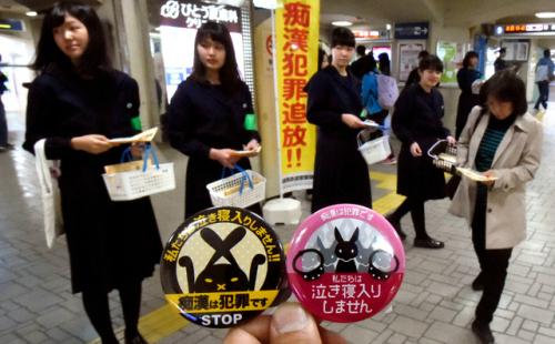 日本地铁里,有志愿者分发预防性骚扰的徽章