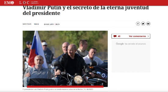黑色皮衣,挎斗摩托车——西班牙《世界报》(El Mundo)26日用一张普京近日骑摩托车亮相克里米亚车展的照片开篇,围绕普京如何维持其“年轻”的外形展开讨论。