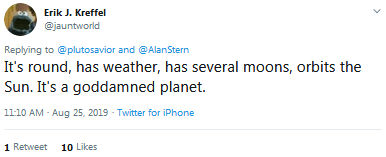 用户@jauntworld:“它(冥王星)是圆的,有(自己的)天气,有几个卫星,还绕着太阳运行。这就是个行星。” ↓