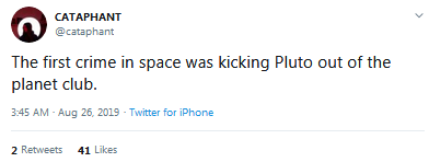 用户@cataphant:“在太空犯下的第一起罪行就是把冥王星踢出行星俱乐部。”↓