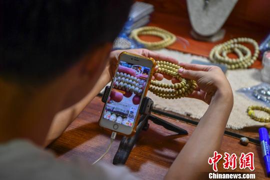 中新网文昌8月27日电 (黄艺)“哥哥姐姐们,这里有件好货,你们喜欢就拍吧。”近日,记者走进海南省文昌市会文镇的一家佛珠加工厂,32岁的龙官富熟练地在直播平台上进行佛珠拍卖,一边和粉丝聊天,一边拍卖写单。以这种方式,龙官富一天可卖出几百条佛珠,月销售额二十多万元,是当地有名的佛珠商家。