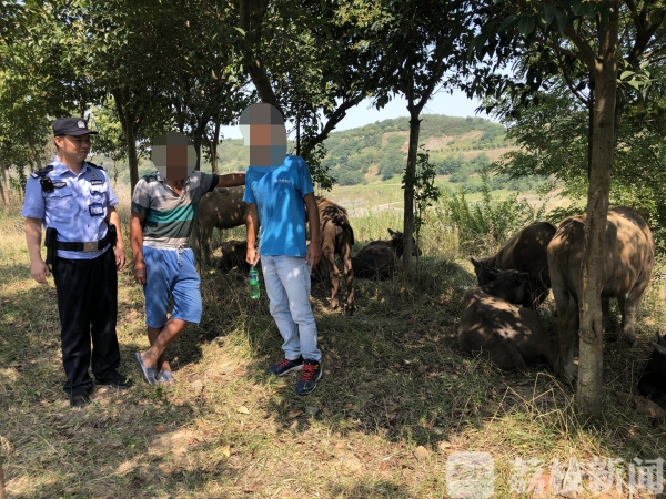 近日,有好心人报警称:发现十多头牛在野外很长时间了,无人看管,还多次穿越马路,很危险,需要民警处理。南京六合公安分局金牛湖派出所民警接到报警后迅速出警。