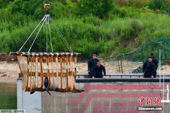 当地时间7月11日,员工们在斯雷德尼亚湾的“鲸鱼监狱”里用卡车将一头虎鲸装载到一个特殊的水箱中,准备将这三头虎鲸运送到奥霍茨克海岸的放生地。