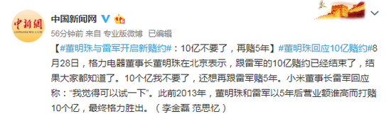 #董明珠回应10亿赌约#8月28日,格力电器董事长董明珠在北京表示,跟雷军的10亿赌约已经结束了,结果大家都知道了。10个亿我不要了,还想再跟雷军赌5年。小米董事长雷军回应称:“我觉得可以试一下”。此前2013年,董明珠和雷军以5年后营业额谁高而打赌10个亿,最终格力胜出。(李金磊 范思忆)