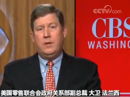 美国零售联合会政府关系部副总裁 大卫⋅法兰西:我们从中国进口很多东西,美国零售业在中国也有很多业务,很多商场在中国有大量投资,所以首先放弃中国市场是不现实的做法;其次这还会严重损害很多美国公司的利益。