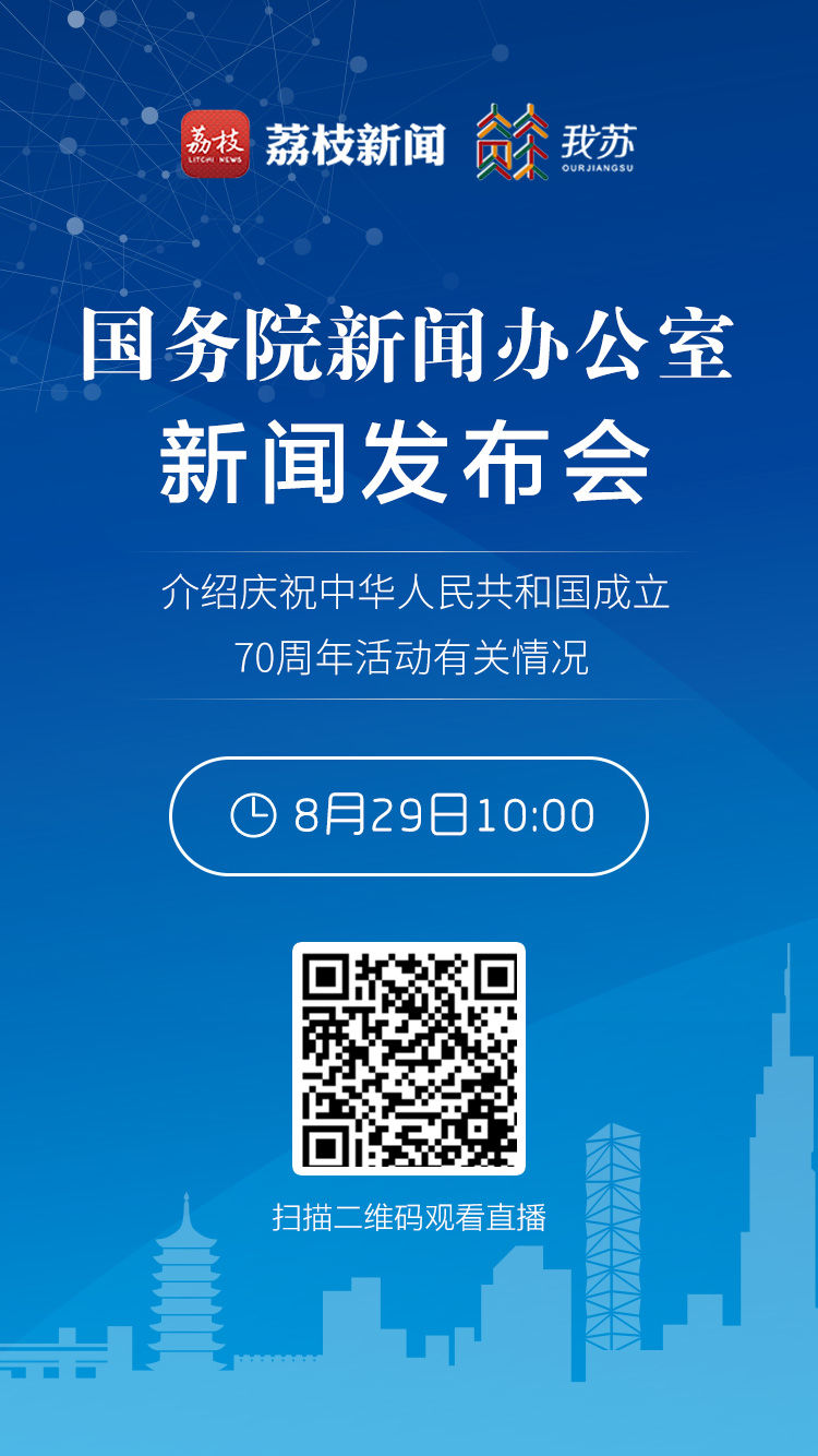 荔枝新闻讯 据国务院新闻办公室客户端消息,国务院新闻办公室将于2019年8月29日(星期四)上午10时举行新闻发布会,请中央宣传部常务副部长王晓晖和有关部门负责人介绍庆祝中华人民共和国成立70周年活动有关情况,并答记者问。发布会由国务院新闻办公室副主任郭卫民主持。