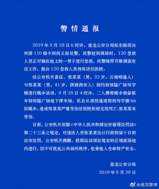 荔枝新闻讯 两男子私自从昆明一写字楼消防通道爬到66层跳伞,其中一人重伤死亡。8月29日,昆明市公安局盘龙分局官方微博就此发布警情通报称,另一男子被处以行政拘留十日的治安处罚。