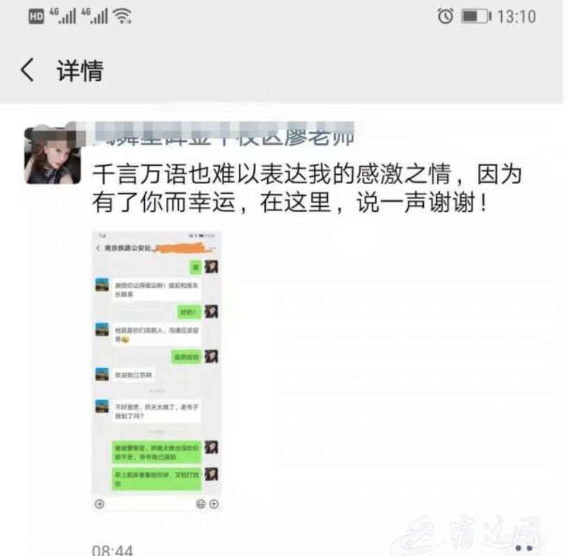 “谢谢曹警官,昨晚也没及时发信息告诉您,我爷爷已经安全到家了。”8月27日上午,上海铁路公安处南京公安处沭阳站派出所副所长曹彬的微信里收到一条感谢信息。原来,这条信息来自四川南江的廖女士,为了感谢曹彬帮助其爷爷,并将他安全送上回家的列车。