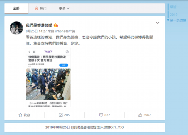 据香港《文汇报》报道,8月28日,一个名为“我们是香港警嫂”的微博获得微博官方确认,引来网友广泛关注。该账号的注册信息中,工作信息一项填写为“香港政府警务署前线执法人员最强后盾”,账号简介称“我们是香港警嫂,我们有话要说”。