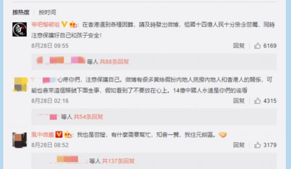 海外网8月29日电 日前,美国社交媒体推特和脸书封锁大量账号,有香港警嫂和警察家属发声直指脸书、推特颠倒事实。近日,多位香港警嫂注册微博账号,表示临近开学,她们担心孩子们的求学安全,并发声求助,希望香港周边城市学校伸出援手。对此,网友们纷纷转发评论,支持警嫂,希望他们的孩子安全与求学得到保障。