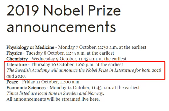 荔枝新闻讯 根据诺贝尔奖官网消息,2019年诺贝尔文学奖揭晓时间已经确定为2019年10月10日星期四,最早在下午1:00公布。