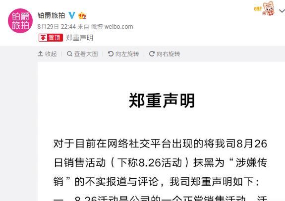 近日,铂爵旅拍被曝涉嫌传销,铂爵旅拍29日深夜发布声明称,其8月26日活动是一个正常的销售活动,活动不是以“拉人头”、“布下线”为方式与目的,更没有用“后来者的钱发上线收益的情形,根本不属于传销,也不涉嫌传销。“对于8月26日活动是否构成传销,我司愿意接受相关主管部门的检视。”