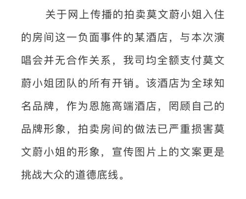 对于酒店的行为,承办此次莫文蔚演唱会的湖北壹天橙文化传媒有限公司声明称,该酒店与本次演唱会并无合作关系,并斥责酒店方拍卖房间的做法“严重损害莫文蔚形象,宣传图片上的文案更是挑战大众的道德底线”。