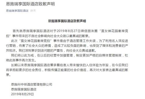 近日,湖北某酒店因拍卖莫文蔚睡过的“余温房”引发热议,29日,该酒店通过公众号就“莫女神花园套房竞拍”事件道歉,称是由于酒店管理工作失误。