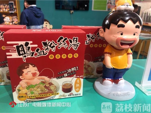 在南京展区,一批城市特色产品,展示了"最南京"的城市魅力。这个眉毛粗粗、憨厚可爱的男生名叫阿槑,他是土生土长的南京人,爱南京的美食,爱南京的历史,也是南京著名的动漫形象。从他的诞生到现在,阿槑今年已经十岁了,以阿槑的名义登记的版权作品现在已经多达500多件。