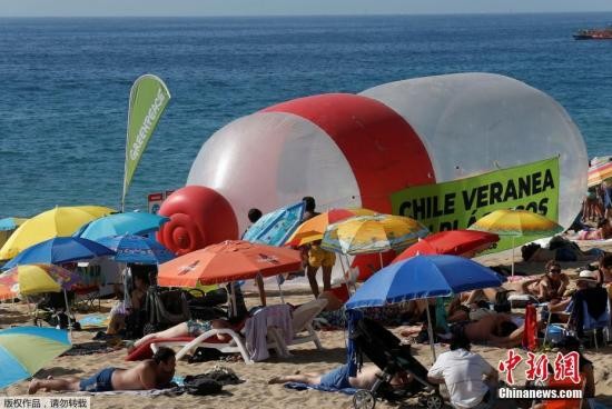 资料图:智利比尼亚德尔马,“绿色和平”组织在海滩上放置巨大塑料瓶,警示塑料污染问题。