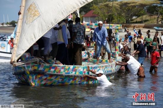 资料图:肯尼亚拉穆岛,肯尼亚第一艘完全由回收塑料制成的单桅帆船在拉穆岛举行启动仪式。