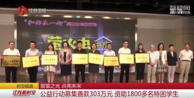 今年暑假,江苏广电总台融媒体新闻中心联合江苏省妇联、江苏省妇女儿童福利基金会、江苏省关心下一代基金会共同发起了"和你在一起·萤火虫书房"全媒体公益行动。立足江苏贫困片区的住房条件,采用"助学金+爱心书房"的帮扶模式,助力脱贫攻坚。相关报道被新华社、人民网、央视网等央媒转载,全网视频总点击量超2000万。公益行动发起以来,众多爱心人士伸出援手,助力孩子圆梦。目前已募集善款303万元,资助江苏省重点贫困片区1800多名特困学生,捐赠爱心书房套装140多套,为困境学子打开一扇梦想之门。